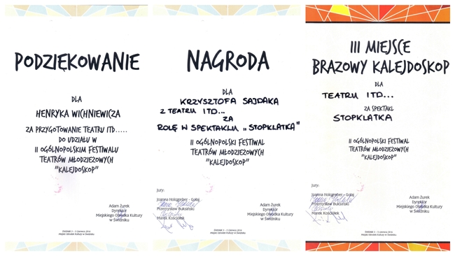 Komisja Artystyczna nagrodziła „STOPKLATKĘ” „Brązowym Kalejdoskopem”, czyli III nagrodą dla zespołu i nagrodą aktorską dla Krzysztofa Sajdaka.