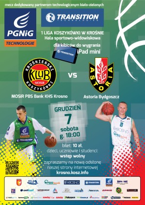 KOSZYKÓWKA: Już w najbliższą sobotę, 7 grudnia do Krosna wraca 1 ligowa koszykówka, a wraz z nią moc atrakcji. Mecz MOSiR PBS Bank KHS Krosno – Astoria Bydgoszcz dedykowany będzie partnerom technologicznym klubu: firmom PGNiG Technologie S.A. oraz Transition Technologies S.A.