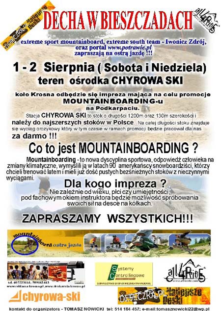 Mountainboarding to nowa dyscyplina sportowa, którą wymyślili snowboardziści w takach 90-tych chcących uprawiać swoje ulubione hobby nawet latem, kiedy zamiast śniegu stoki porasta zielona trawa. Sport ten cieszy się coraz wiekszą popularnością dlatego w dniach od 1-2 sierpnia na terenie ośrodka CHYROWA SKI (koło Dukli) odbędzię się impreza, która ma na celu popularyzację tego spotru na Podkarpaciu.
