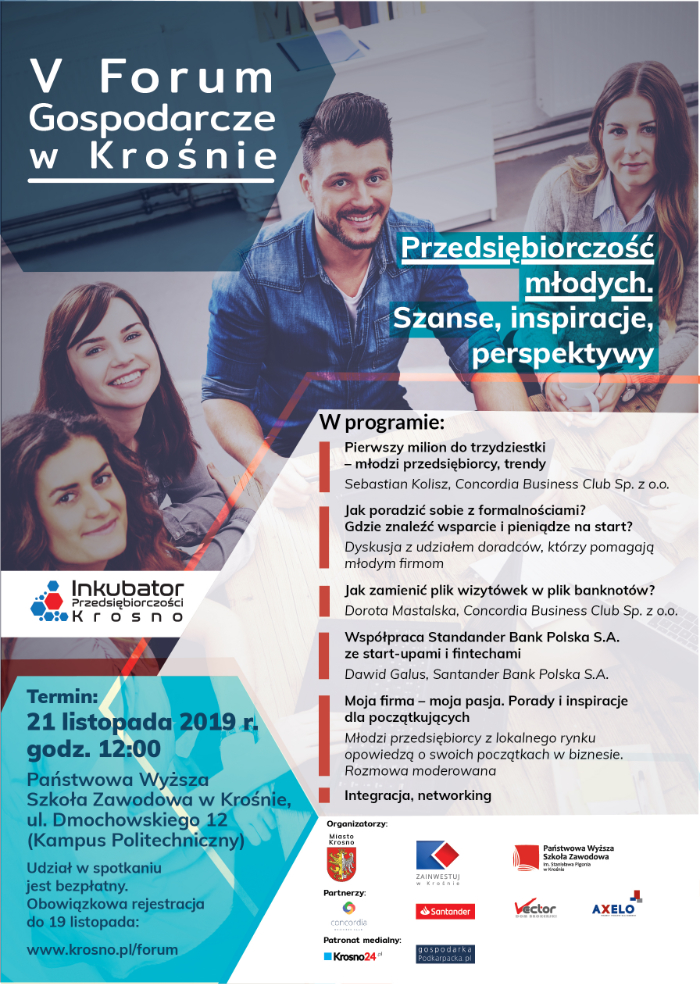 Na V Forum Gospodarcze zapraszają organizatorzy – Prezydent Miasta Krosna oraz Rektor Państwowej Wyższej Szkoły Zawodowej im. S. Pigonia w Krośnie. Wydarzenie odbywa się w ramach Światowego Tygodnia Przedsiębiorczości.