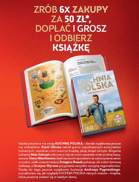 Jak zdobyć książkę „Kuchnia Polska według Karola Okrasy”?Książka, będzie dostępna w promocji w sklepach Lidl w całej Polsce od 10 do 30 listopada. Aby zdobyć jeden z egzemplarzy, wystarczy zebrać 6 naklejek. Każda jest przyznawana klientowi za zakupy o wartości 50 zł . Po zebraniu naklejek należy dopłacić w kasie sklepu 1 grosz i odebrać swoją książkę „Kuchnia Polska według Karola Okrasy”. Szczegóły dotyczące promocji będą dostępne na stronie www.lidl.pl.
