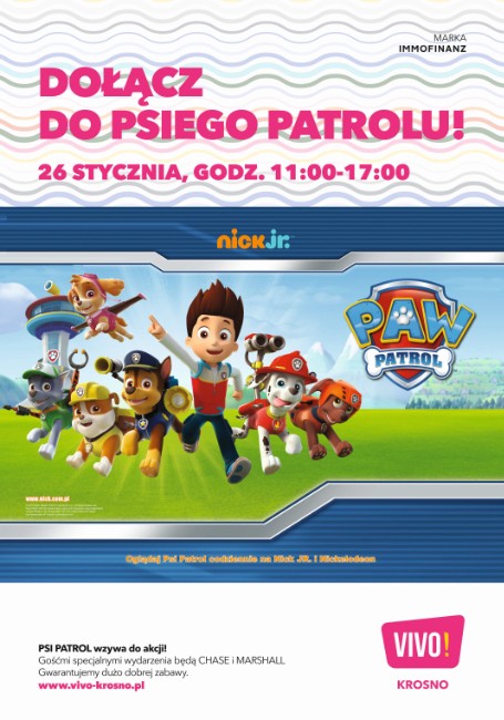 W najbliższą sobotę, 26 stycznia, w godz. od 11.00 do 17.00, VIVO! Krosno zaprasza wszystkie dzieci do wspólnej zabawy z bohaterami serialu animowanego "Psi Patrol" – Chase’m i Marshallem. Najmłodsi będą mieli okazję sprawdzić swoje umiejętności, podejmując przygotowane przez bohaterską ekipę wyzwania, a także wziąć udział w konkursach z atrakcyjnymi nagrodami.